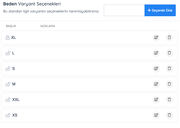 Gelen sayfadan varyant başlıklarımızı ve bu başlıklara ait varyant özelliklerini tanımlayabiliriz.